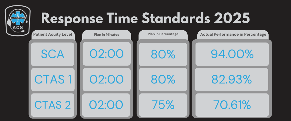 The table below outlines the target response time for Muskoka ACS as well as the percentage of time the target response will be met. The time for SCA, CTAS 1 & CTAS 2 patients is regulated in the Ambulance Act as noted below: